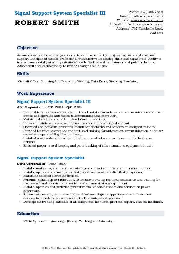 25u Signal Systems Support Specialist Resume Example Company Name Austin Texas