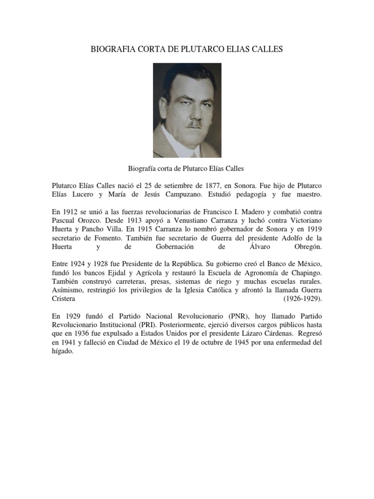 Plutarco Elas Calles 1877-1945 fue un lder y presidente revolucionario mexicano cuyas reformas econmicas constitucionales y claves proporcionaron una base slida para la posterior estabilidad gubernamental de Mxico. Fue bautizado el 1 de septiembre en la iglesia de San Andrs Apstol en Jimnez del TelSu padre luch al lado de Luis Moya primer Jefe Maderista en Zacatecas. Plutarco Elas Calles Maestro de escuela en el estado de Sonora en 1912 abandon su labor docente para ingresar en el ejrcito revolucionario del general lvaro Obregn como capitn.
