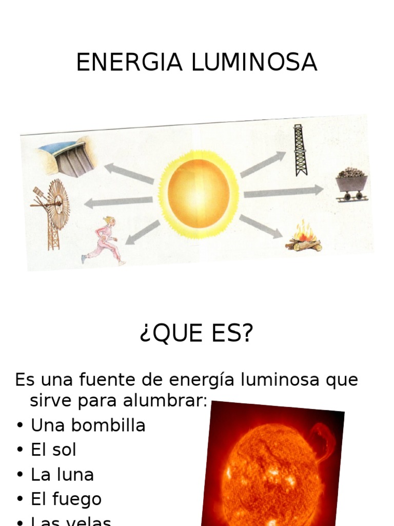 Podemos destacar la existencia de energa lumnica absorvida que se aplica en clulas fotovoltaicas. -La energa de luz tiene la capacidad de broncear o quemar nuestra piel se puede aprovechar para fundir metales o calentar la comida. -El Sol es el mejor ejemplo de energa luminosa.
